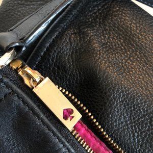 Excellent condition! Lightly used Kate Spade purse with a bright pink lining, gold hardware all surrounded by the signature black pebble leather. Perfect size, style and shape for day-to-day use. 15 inches wide, 10 inches tall, with 20 inch shoulder strap.