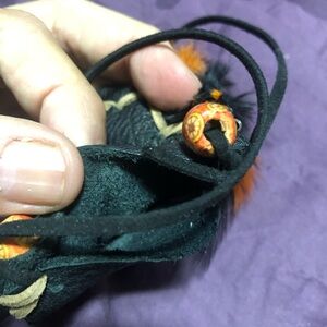 Unique black leather pouch with orange feather accents. Features a decorative emblem and drawstring closure.