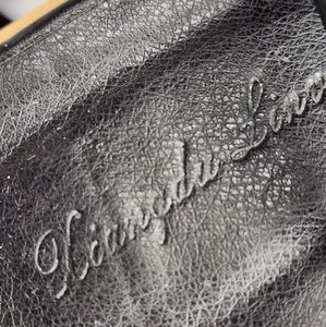 Black lambskin leather square point toe Ballet Slingback Mule sandals with wrap around ankle straps and short block heel, by Xiangda Liao.