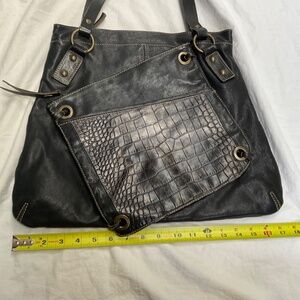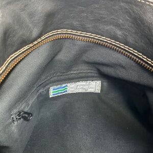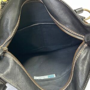 This black leather tote is in excellent, never-or-rarely-used, clean condition. The leather is thick and soft, and with that interesting asymmetrical pocket on the front, this is a really unique bag. Arnold Churgin sold higher end shoes and accessories in Calgary for many years. They were known for quality, and this bag is amazing.
