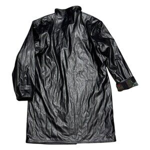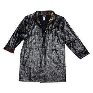 Elevate your style with this sleek black leather trench coat featuring a vibrant, colorful lining. Perfect for any occasion.