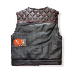 Experience style and comfort with the black leather vest. Perfect for layering, this vest features a sleek design with a touch of rugged elegance.