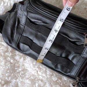Sleek and versatile black leather waist bag, perfect for everyday use. Features multiple zippered compartments for secure storage.