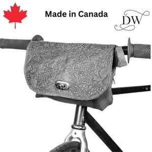this bag does not have the embossed maple leaves. This bag is identical to the first 3 photos with the blue background. The other photos are just to show how it can be worn.