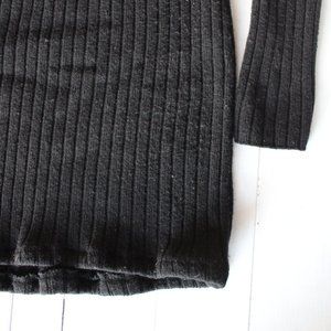 A long sleeve crewneck mini sweater dress with a thick and cozy ribbed knit material. The hemline has been altered to be short (mid thigh length); perfect for pairing with tall boots and tights for fall weather or for a Christmas party.