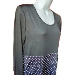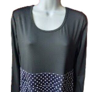Appears to be a top and a skirt but this is a one-piece item. The top is solid black and the skirt is black and white polka dots. There is no fabric content tag or brand tag. Only a size tag. It is in very good condition