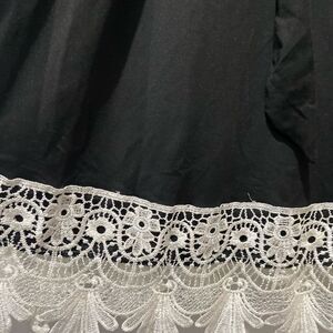 This black gown is designed with long bell sleeves and a crew neck, offering a sophisticated look for both casual and work settings. The dress features a tie front that accentuates the waist, while the white lace trim adds a touch of elegance to the sleeves and hem.