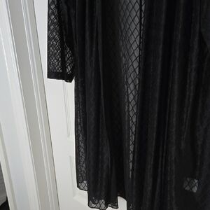 This black robe jacket offers a sleek and sophisticated look, perfect for layering over any outfit. Its long sleeves and flowing design provide both comfort and style, making it an essential addition to your outerwear collection.
