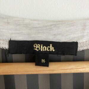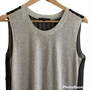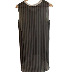 A high low tunic that is grey jersey in front and striped sheer chiffon in back.