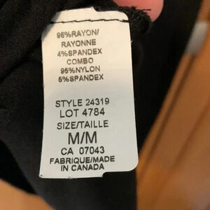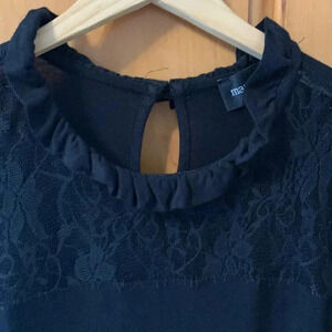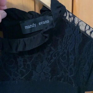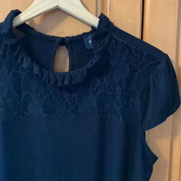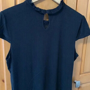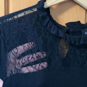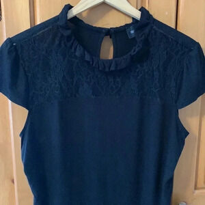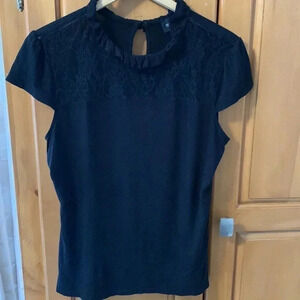 Pretty black top with lace at neckline. Capped sleeves. Stretch. Black. Size Medium.