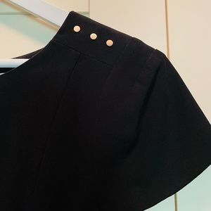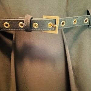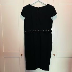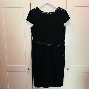 Marks & Spencer black dress, fully lined, belted, with pockets, zip up back, gold coloured detailing. Very flattering, fully lined, ideal for the office. Falls just below the knee, short sleeves. Excellent condition, machine washable. UK size 16, fits US size 12.