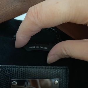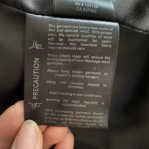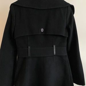 Authentic Mackage wool and genuine leather trim peacoat. Features buttons down the length of the jacket to secure in place, a cinched back for a flattering fit, and leather trimmed pockets with zippers. This jacket is perfect for fall and early winter wear! Only worn for one season, great condition. Size small.