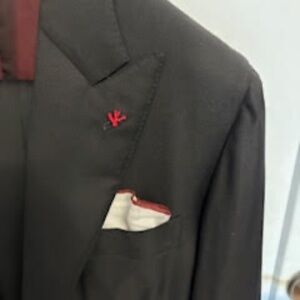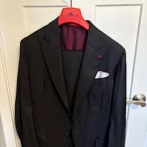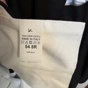 single-breasted suit, cool wool, solid black color, brand logo, lapel collar, long sleeves, fully lined, zipper fastening, button fastenings, multipockets, dual back vents, mid rise, belt loops, dry clean, do not bleach, do not tumble dry