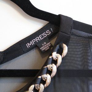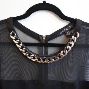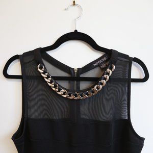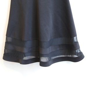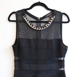 Black dress with mesh cutouts at the top, mid-section, and bottom of the dress