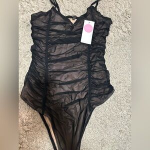 Elegant black mesh bodysuit with ruched detailing, perfect for a stylish and comfortable fit.