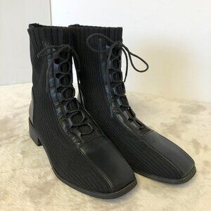 Black Mid Calf Ribbed Stretch Lace Up Low Heel Boots Size 37 (6.5 US)