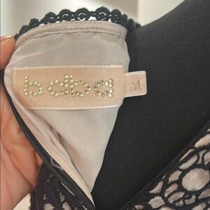 This stunning black mini sheath dress showcases a sleeveless design and a classic crew neck. The intricate lace detailing creates a layered texture, while the form-fitting silhouette ends above the knee, making it an ideal choice for a night out.