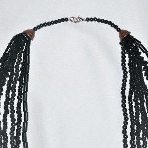 Nice Black Multi-Strand Choker Made up of Seed/Tube/Round & Faux Stone Beads With Bronze Colored Accents & Silver Tone, Lobster Claw Clasp. Total 9 Strands. App.19.5" When Open. In New, Unworn Condition.