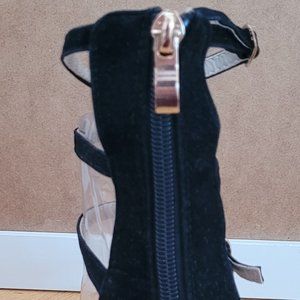 Simple, Classic Sandals in Black Velvet. Sexy Ankle-Strap, Multi-Strap Tied Detail. Open Toe Buckle Pumps.