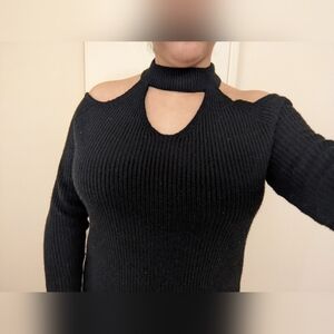 Stay stylish and comfortable with this chic black cut-out sweater. Perfect for any occasion.
