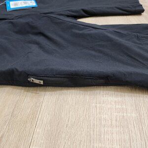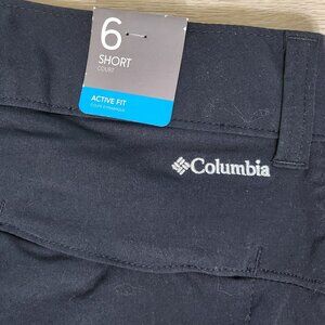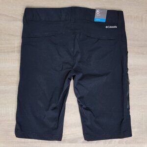 Columbia Ladies Shorts, Omnishade in Black colour. Size 6. Fully Pocketed, including a pocket on the leg, 5 pockets total. New with tags, unworn. Active Fit. Nylon & Elastine. Double snap & zipper closure. Belt loop style pant waistband allows for use of belt or lanyards. Great trail & hiking shorts or just around the town shorts as they are practical and attractive. Fabric has some stretch to it. Shorts fit long to almost knee and can be folded up. Low to average rise for most. 33 inches waist circumference aprox.