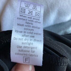 This bathing suit does not have a tag but is of good quality. The vertical lines coming down nicely accentuate the waist line.