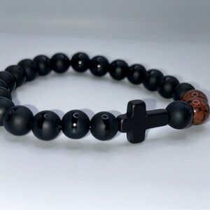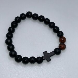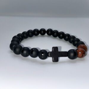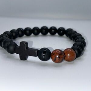 This handcrafted beaded bracelet combines the protective power of Black Onyx with the stabilizing energy of Mahogany Obsidian, finished with a sleek black cross centerpiece.