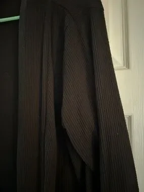 Soft ribbed knit cardigan. Open front with draped collar. Long sleeves and relaxed fit. Versatile black layering piece.