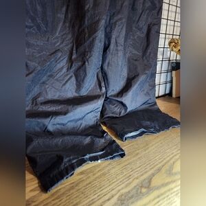 These black pants feature a loose relaxed fit and an elastic waistband for comfort. Made from a lightweight synthetic material, they are designed for outdoor or athletic use, providing a slightly shiny appearance and a crinkled texture.