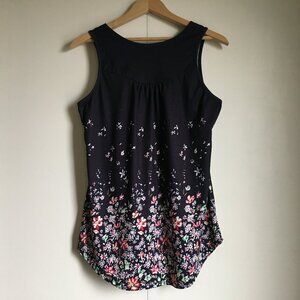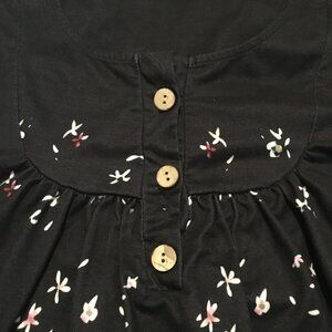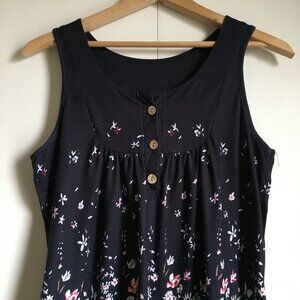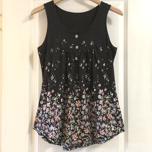 Good preowned vintage condition, black, button collar, babydoll fit tank top featuring tiny flowers in pastel colours at the hem gradually thinning out as they float upwards in mint green, pink, white and red. Buttons are made of wood I believe. Very sweet. Perfect for summer.