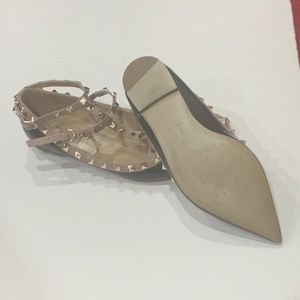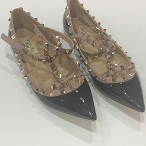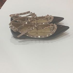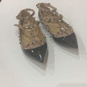 Black Patent Two Tone Kaitlyn Pan Studded Flats Ankle Straps Sz. 8.5