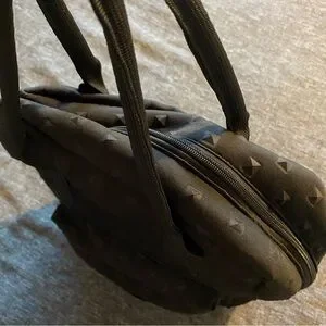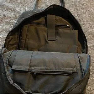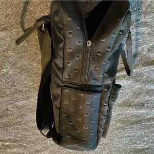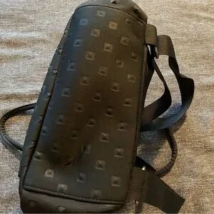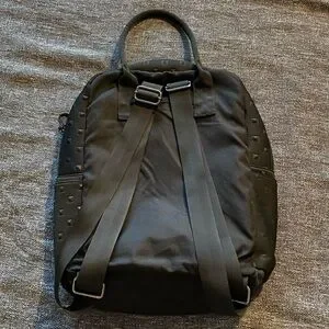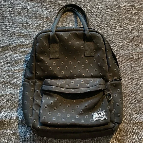 Everyday backpack in sleek black with subtle square pattern. Spacious main compartment, front pocket, and side compartments. Gently used and in great condition — only missing one zipper puller (zipper still works perfectly).