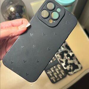 Elegant black phone cases. Features heart and camouflage patterns. Offers style and protection.