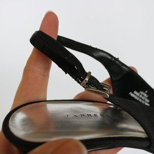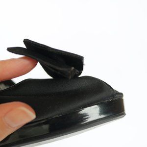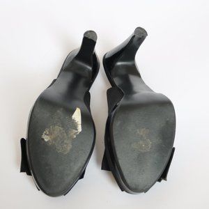 These are in great condition with very little wear. As pictured, there's a few marks on the heels, the elastic part of the sling back is a bit crunchy just from drying out a bit, and one of the bows has a slight bend that's not really noticable when you're wearing them!