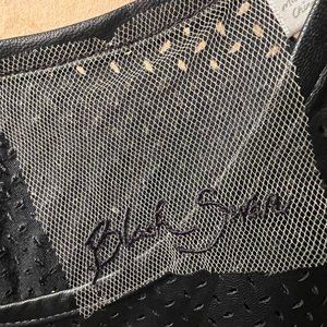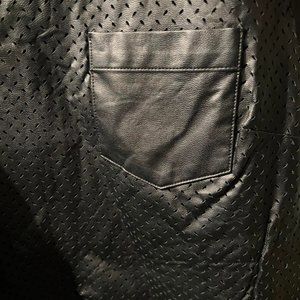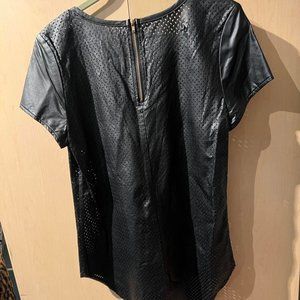 This pleather / faux leather black top is made up of tiny slits (see pictures). Although barely noticeable, some were stretched (nothing more than in the photo where it shows this). A great Spring or Summer top!