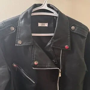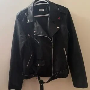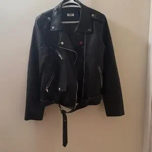 Stylish black faux leather biker jacket with silver zippers and buttons. Perfect for a bold look. Honestly if I had somewhere to wear this I would keep it forever. Feels buttery soft, excellent condition.