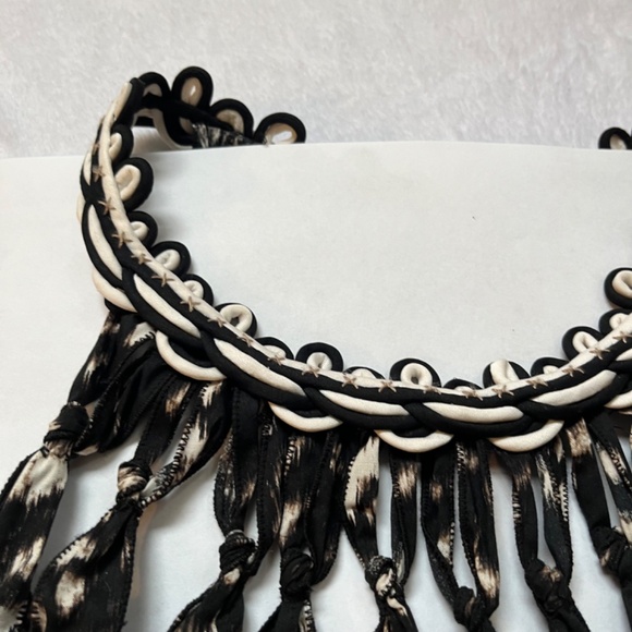 Black printed dress Woven detail at neck Cut-outs at chest