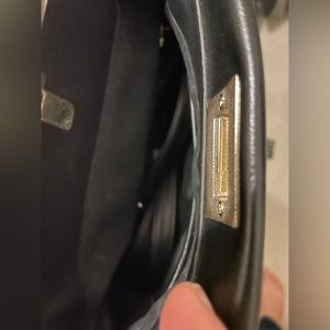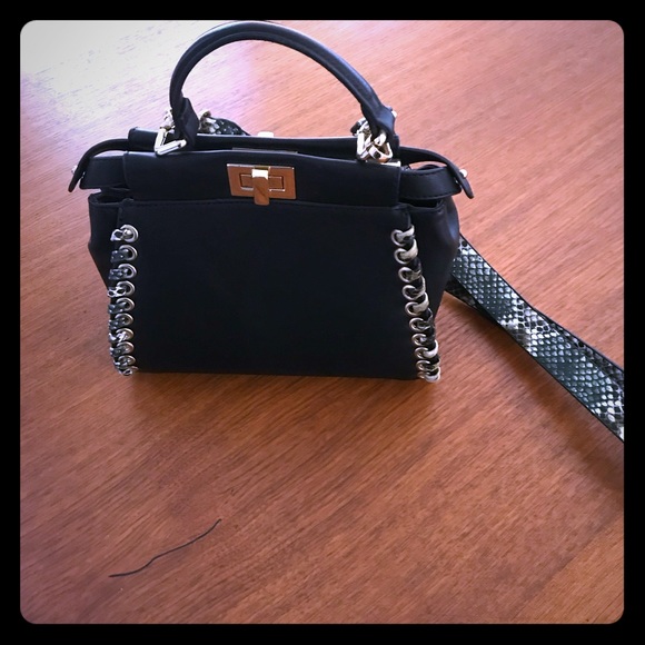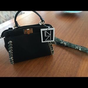 Modern high end runway inspired stylish Black purse with python style strap. 2 pockets. Approximately 9.5 in l x 8.5 in h x 4.5 in w