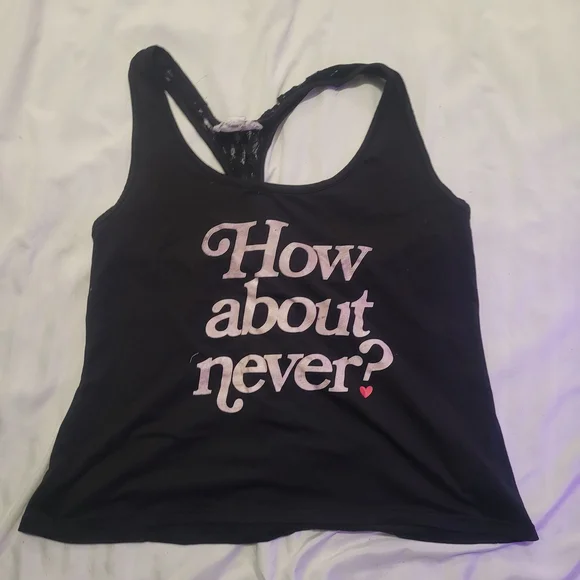 Soft black racerback tank featuring light pink scripted text that reads “How about never?” for a playful look. Lightweight stretch fabric offers breathable comfort for everyday wear. Feminine pink lettering adds a subtle pop against the black base.