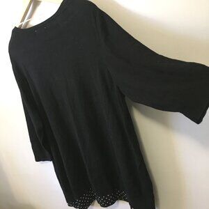 Very good preowned condition, black cotton/rayon blend, 3/4 or half sleeve sweater with fabric insert at the hem and collar featuring a white on black polka dot pattern. Natural fabric, well made and oh so cute.