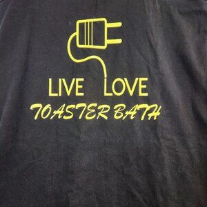 This stylish 3XL black tank top features a bold razor back design, perfect for casual wear. The standout graphic includes a yellow power plug, accentuated by an edgy 'Live Love Toaster Bath' slogan. Ideal for those who appreciate humor and unique fashion statements, this tank offers both comfort and personality. Pair it with your favorite jeans or shorts for an effortless look.