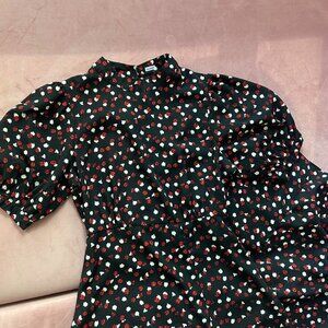 This dress features poofy sleeves and a floral pattern all over. The dress gives that elegant regency style with a modernized flare. As pictured, there is a slit on the hem.