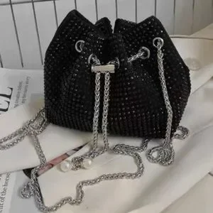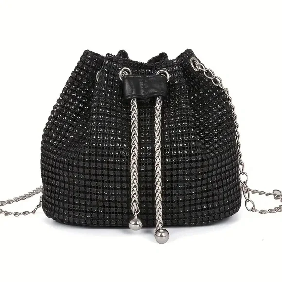 Stylish black Rhinestone drawstring bag featuring a silver chain. Perfect for a night out. Big enough to carry your I.D. Lipstick and phone.