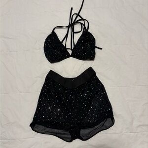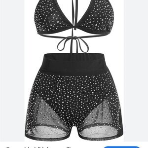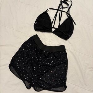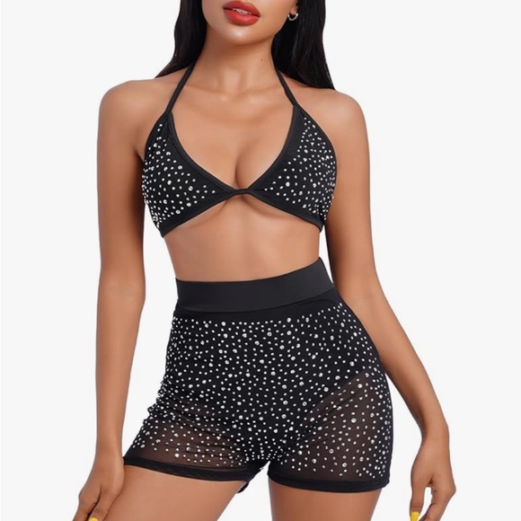 Two-piece black bikini set with sparkling rhinestone embellishments. Halter triangle top and high-waist mesh shorts. Stretchy fit and eye-catching shimmer.