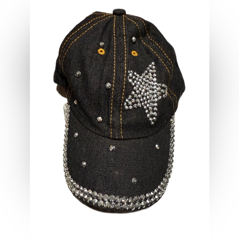 Stylish black cap adorned with sparkling rhinestones and a star design. Perfect for adding a touch of glam to any outfit.