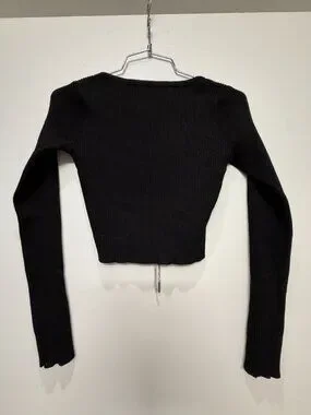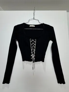 Black Ribbed Crop Top w/ Rhinestone Drawstring