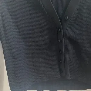 Black ribbed cardigan with button closure. Deep v-neck. Small buttons closure.