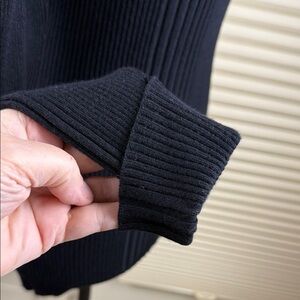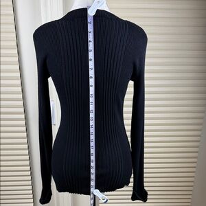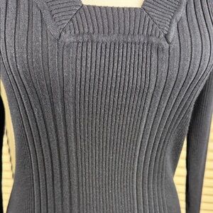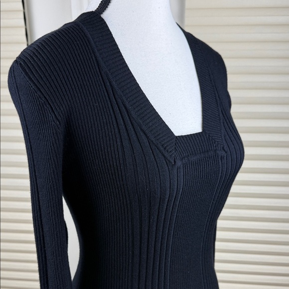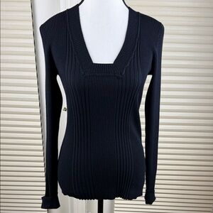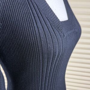 Classic black, Majora V-neck sweater. It features a stylish ribbed knit design and a flattering, form-fitting silhouette. Has cuffed sleeves. Made from a comfortable and stretchy rayon and polyester blend, this top is perfect for layering or wearing on its own. Has a unique square v-neck. This sweater can be worn for various occasions, from casual outings paired with jeans or leggings, to the office in a business casual setting, or to more dressed-up events like a date night or cocktail party. Has stretch.