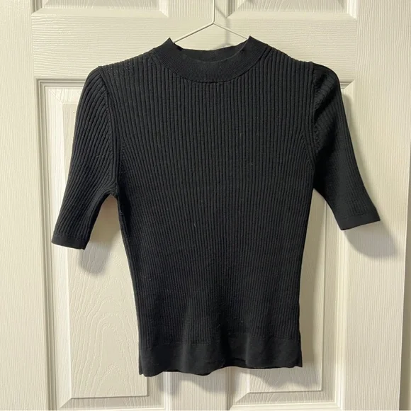 Stylish black ribbed knit top with short sleeves. Perfect for any occasion.