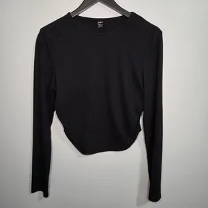 Elevate your basics with this chic black long-sleeve top from SHEIN. Featuring a ribbed texture and flattering ruched/cinched sides, this top has a unique curved hemline that creates a stunning silhouette. Perfect for pairing with high-waisted jeans or a cute skirt!
